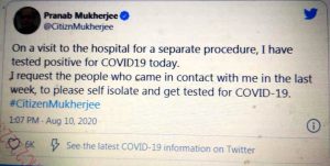 उन्होनें अपने ट्वीट में लिखा कि पिछले एक हफ्ते में जो भी लोग मेरे संपर्क में आए हैं, मैं उनसे अपील करता हूं कि वो सभी टेस्ट करवाएं और आइसोलेट हो जाएं। बतायाजा रहा है कि प्रणब मुखर्जी को उनकी 84 बढ़ती उम्र के कारण भी उन्हें चलते अस्पताल में दाखल कराया गया है। सीनियर कांग्रेसी नेता रहे प्रणब मुखर्जी 2012 से 2017 के बीच देश के राष्ट्रपति रहे हैं। पिछले साल 2019 में केंद्र सरकार ने उन को देश के सर्वोच्च सम्मान भारत रत्न से सम्मानित किया था। बता दें कि इस से पहले केंद्रीय गृह मंत्री अमित शाह भी कोरोना पॉजिटिव पाए गए थे, जिसके बाद उन्हें मेदांता के अस्पताल में भर्ती कराया गया था। अब उनकी रिपोर्ट निगेटिव आ चुकी है।