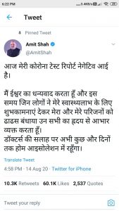 भारत के गृहमंत्री अमित शाह के बारे में बड़ी खबर सामने आई है। उनकी दूसरी कोरोना रिपोर्ट निगेटिव आई है। गृहमंत्री ने खुद इस बारे में ट्वीट करके जानकारी दी है। उन्होनें टवीट किया है – आज मेरी कोरोना टेस्ट रिपोर्ट नेगेटिव आई है। मैं ईश्वर का धन्यवाद करता हूँ और इस समय जिन लोगों ने मेरे स्वास्थ्यलाभ के लिए शुभकामनाएं देकर मेरा और मेरे परिजनों को ढाढस बंधाया उन सभी का ह्रदय से आभार व्यक्त करता हूँ। डॉक्टर्स की सलाह पर अभी कुछ और दिनों तक होम आइसोलेशन में रहूँगा।