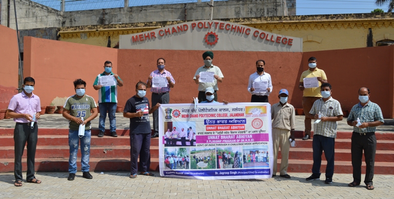 ਪ੍ਰਿੰਸੀਪਲ ਡਾ. ਜਗਰੂਪ ਸਿੰਘ ਜੀ ਦੀ ਸਰਪ੍ਰਸਤੀ ਹੇਠ ਪ੍ਰੋ. ਕਸ਼ਮੀਰ ਕੁਮਾਰ (ਕੌਆਰਡੀਨੇਟਰ) ਦੀ ਯੋਗ ਅਗਵਾਈ ਵਿੱਚ ਮੇਹਰ ਚੰਦ ਪੋਲੀਟੈਕਨਿਕ ਕਾਲਜ ਜਲੰਧਰ ਨੇ ਭਾਰਤ ਸਰਕਾਰ ਦੇ ਮਨੁੱਖੀ ਸਰੋਤ ਵਿਕਾਸ ਮੰਤਰਾਲੇ ਦੁਆਰਾ ਚਲਾਈ ਗਈ ਉੱਨਤ ਭਾਰਤ ਅਭਿਆਨ ਸਕੀਮ ਤਹਿਤ ਕੋਰੋਨਾ ਤੋਂ ਬਚਣ ਲਈ ਅੱਜ ਮਾਸਕ ਅਤੇ ਸੈਨੀਟਾਈਜ਼ਰ ਵੰਡਣ ਦਾ ਕੰਮ ਕਾਲਜ ਤੋ ਸ਼ੁਰੂ ਕੀਤਾ ਗਿਆ। ਇਸ ਸਕੀਮ ਤਹਿਤ ਕਾਲਜ ਨੇ ਪੰਜ ਪਿੰਡ ਅਖਿਤਆਰ ਕੀਤੇ ਹੋਏ ਹਨ ਅਤੇ ਉਨ੍ਹਾਂ ਦੀ ਬਿਹਤਰੀ ਵਾਸਤੇ ਸਾਡੀ ਟੀਮ ਹਰ ਸੰਭਵ ਉਪਰਾਲਾ ਕਰ ਰਹੀ ਹੈ।ਪਿੰਡਾਂ ਦੇ ਲੋਕਾਂ ਦੀ ਨਰੋਈ ਸਿਹਤ ਦੀ ਕਾਮਨਾ ਕਰਦਿਆਂ ਅੱਜ ਮਾਣਯੋਗ ਪ੍ਰਿੰਸੀਪਲ ਸਾਹਿਬ ਨੇ ਮਾਸਕ ਅਤੇ ਸੈਨੀਟਾਈਜ਼ਰ ਵੰਡਣ ਦਾ ਕੰਮ ਸ਼ੁਰੂ ਕੀਤਾ ਤਾਂਕਿ ਲੋਕ ਕੋਰੋਨਾ ਤੋ ਡਰ ਕੇ ਨਹੀ ਬਲਕਿ ਉਸਦਾ ਡਟ ਕੇ ਮੁਕਾਬਲਾ ਕਰ ਸਕਣ।ਇਸ ਮੋਕੇ ਤੇ ਕੋਰੋਨਾ ਤੋਂ ਜਾਗਰੁਕ ਕਰਨ ਲਈ ਇੱਕ ਰੰਗੀਨ ਇਸ਼ਤਿਹਾਰ ਵੀ ਜਾਰੀ ਕੀਤਾ ਗਿਆ।ਇਸ ਸਕੀਮ ਦਾ ਮੁੱਖ ਮਨੋਰਥ ਪਿੰਡਾਂ ਦਾ ਸਰਵਪੱਖੀ ਵਿਕਾਸ ਕਰਵਾਉਣਾਂ ਹੈ।ਇਸ ਫ਼ਲੈਗਸ਼ਿੱਪ ਪ੍ਰੋਗਰਾਮ ਦੀ ਦੇਖ-ਰੇਖ ਆਈ.ਆਰ.ਡੀ, ਆਈ.ਆਈ.ਟੀ, ਨਵੀ ਦਿੱਲੀ ਕਰ ਰਹੀ ਹੈ।ਸਾਡੀ ਟੀਮ ਇਨ੍ਹਾ ਪੰਜਾਂ ਪਿੰਡਾਂ ਦਾ ਸ੍ਰਵੇਖਣ ਕਰ ਰਹੀ ਹੈ,ਜਿਸ ਦਾ ਮੁੱਖ-ਮੰਤਵ ਪਿੰਡਾਂ ਦੀਆਂ ਦਰਪੇਸ਼ ਸਮੱਸਿਆਵਾਂ ਦਾ ਢੁਕਵਾਂ ਹੱਲ ਲੱਭਣਾ ਹੈ।ਪਿੰਡਾਂ ਦੀਆਂ ਪੰਚਾਇਤਾਂ ਅਤੇ ਇਲਾਕੇ ਦੇ ਪੰਤਵੰਤੇ ਸੱਜਨਾਂ ਦੀ ਮੱਦਦ ਨਾਲ ਪਿੰਡਾਂ ਦਾ ਸਰਵਪੱਖੀ ਵਿਕਾਸ ਕਰਵਾਉਣਾਂ ਇਸ ਸਕੀਮ ਦਾ ਮੁੱਖ ਉਦੇਸ਼ ਹੈ।ਅਸੀ ਜਿੱਥੇ ਇਲਾਕੇ ਦੇ ਲੋਕਾਂ ਨੂੰ ਤਕਨੀਕੀ ਸਿੱਖਿਆ ਮੁਹੱਇਆ ਕਰਵਾਉਂਦੇ ਹਾਂ ਉੱਥੇ ਸਵੈ-ਸੇਵੀ ਸੰਸਥਾਵਾਂ ਦੀ ਮੱਦਦ ਨਾਲ ਪਿੰਡਾਂ ਦੀ ਸਵੱਛਤਾ,ਸਵੱਸਥਾ ਦਾ ਧਿਆਨ ਰੱਖਦਿਆਂ ਸੱਭਿਆਚਾਰਕ ਅਤੇ ਭਾਈਚਾਰਕ ਸਾਂਝ ਪੈਦਾ ਕਰਦੇ ਹਾਂ।ਇਲਾਕੇ ਦੇ ਨੋਜਵਾਨਾਂ ਨੂੰ ਸਿੱਖਿਅਤ ਕਰਕੇ ਪੈਰਾਂ ਤੇ ਖੜਾ ਕਰਨਾ ਅਤੇ ਸਮੇਂ ਦੇ ਨਾਲ ਸਮਾਜ ਵਿੱਚ ਨਸ਼ਾ-ਖੋਰੀ, ਦਹੇਜ ਪ੍ਰਥਾ, ਬਾਲ-ਮਜਦੂਰੀ, ਫਿਰਕਾ-ਪ੍ਰਸਤੀ ਅਤੇ ਜਾਤੀ-ਵਾਦ ਵਰਗੀਆਂ ਪੈਦਾ ਹੋਈਆਂ ਕੁਰੀਤੀਆਂ ਤੋ ਜਾਗਰੂਕ ਕਰਨਾ ਸਾਡਾ ਮੁੱਖ ਮਨੋਰਥ ਹੈ।ਆਧੁਨਿਕ ਤਕਨੀਕਾਂ ਰਾਹੀਂ ਪਿੰਡਾਂ ਦੇ ਲੋਕਾਂ ਦਾ ਜੀਵਨ ਪੱਧਰ ਉੱਚਾ ਚੁੱਕਣਾ ਸਾਡੀ ਸੰਸਥਾ ਦੀ ਪਹਿਲ ਹੈ ਤਾਂਕਿ ਉਹ ਸਮੇਂ ਦੇ ਹਾਣੀ ਹੋ ਸਕਣ।ਸਮੇਂ –ਸਮੇਂ ਤੇ ਭਾਰਤ ਸਰਕਾਰ ਦੀਆਂ ਹਦਾਇਤਾਂ ਅਨੁੰਸਾਰ ਸਾਡੀ ਸੰਸਥਾ ਉੱਨਤ ਭਾਰਤ ਅਭਿਆਨ ਵਿੱਚ ਵੱਧ-ਚੜ ਕੇ ਯੋਗਦਾਨ ਕਰਦੀ ਰਹੇਗੀ ਤਾਂ ਜੋ ਪਿੰਡਾਂ ਦੀ ਨੁਹਾਰ ਨੂੰ ਬਦਲਿਆ ਜਾ ਸਕੇ।ਇਸ ਮੋਕੇ ਤੇ ਸ਼੍ਰੀ ਰਾਕੇਸ਼ ਸ਼ਰਮਾ,ਨੇਹਾ,ਅਖਿਲ ਭਾਟੀਆ, ਸੁਰੇਸ਼ ਕੁਮਾਰ ਅਤੇ ਹੋਰ ਮੌਜੂਦ ਸਨ ।