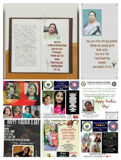 एन.एस.एस. वालंटियर्स ने ई-पोस्टर, ई-कार्ड एवं वीडियो के माध्यम से अपने अध्यापकों के प्रति विशिष्ट भाव व्यक्त किए। कोविड-19 के इस दौर पर उन्होंने सोशल डिस्टैंसिंग का पालन करते हुए सोशल मीडिया के माध्यम से अपनी शुभकामनाएं अपने शिक्षकों तक पहुंचाईं।