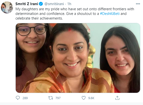 केंद्रीय मंत्री स्मृति ईरानी ने ट्वीट किया, ‘मेरी बेटियां मेरी गौरव हैं, जिन्होंने दृढ़ संकल्प और आत्मविश्वास के साथ अलग-अलग चुनौतियों को पार किया है। #DeshKiBeti की उपलब्धियों का जश्न मनाएं।’ केंद्रीय मंत्री प्रकाश जावड़ेकर ने ट्वीट किया, ‘आइये हम, सभी बेटियों को सशक्त बनाने, और उन्हें अपने सपनों को नई उड़ान देने के लिए प्रेरित करें। और यह संकल्प लें की उनकी सुरक्षा में कोई कमी ना रहे।’