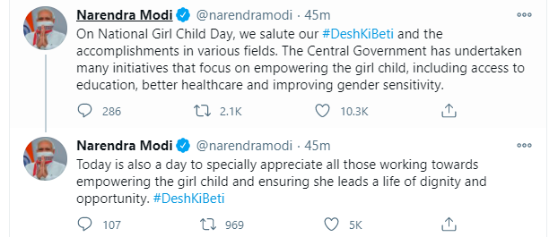 भाजपा अध्यक्ष जेपी नड्डा ने ट्वीट किया, ‘विद्यालयों मे बेटियों के नामांकन मे बढ़ोतरी, लिंगानुपात मे सुधार से स्पष्ट है कि बेटियों के लिए चलाई जा रही योजनाओं को साकार करने में देश ने भरपूर योगदान दिया है। #DeshKiBeti को आत्मनिर्भर बनाने के लिए सरकार निरंतर प्रयासरत है और सदैव प्रतिबद्ध रहेगी। बेटियों को पुनः शुभकामनाएं ! राष्ट्रीय बालिका दिवस पर देश की सभी बेटियों को हार्दिक शुभकामनाएं। हमारी बेटियां हमारा गर्व है। प्रधानमंत्री नरेंद्र मोदी जी के ‘बेटी बचाओ, बेटी पढ़ाओ’ के मूलमंत्र को लेकर हमारी सरकार ने #DeshKiBeti के लिए जन्म से लेकर उच्च शिक्षा, स्वास्थ्य व कौशल विकास के लिए कई कदम उठाए है