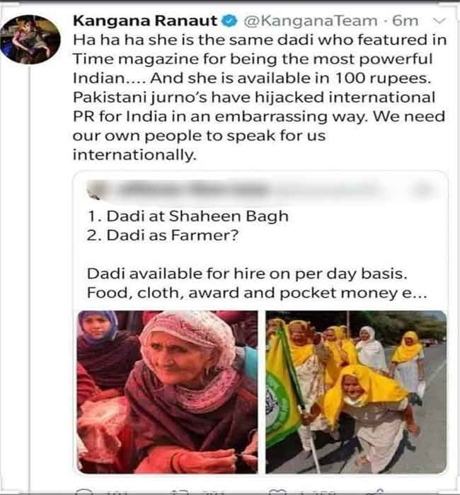 कंगना रनोट के ट्वीट के बाद बठिंडा के गांव जंडियां निवासी बुजुर्ग महिंदर कौर का एक वीडियो भी सामने आया था, जिसमें महिला ने कंगना को कड़ा जवाब दिया। बुजुर्ग महिला ने कहा था कि उनके पास 13 एकड़ जमीन है। उन्हें 100 रुपये लेकर कहीं जाने की जरूरत नहीं है। हां, अगर कोरोना के कारण कंगना के पास काम नहीं है तो उनके खेतों में अन्य मजदूरों के साथ काम कर सकती है।