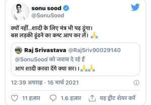 राज श्रीवास्तव नाम के यूजर ने सोनू सूद से अपनी शादी कराने को लेकर सवाल करते हुए लिखा, ‘आप शादी करवा देंगे क्या सर’ इस एक्टर ने मजेदार प्रतिक्रिया देते हुए जवाब में लिखा, ‘क्यों नहीं…..शादी के लिए मंत्र भी पढ़ दूंगा। बस लड़की ढूंढने का कष्ट आप कर लें.’