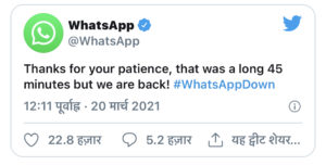 देर रात 12 बजे के बाद व्हाट्सएप ने ट्वीट कर यूजर्स को बताया कि ”आपके धैर्य के लिए धन्यवाद, यह एक लंबा 45 मिनट था, लेकिन हम वापस आ गए हैं!” वहीं, करीब साढ़े 12 बजे के बाद इंस्टाग्राम ने भी ट्वीट कर कहा है कि ”कुछ लोग पहले अपने इंस्टाग्राम अकाउंट्स के साथ समस्या कर रहे थे, लेकिन अब हम वापस आ गये हैं. इस मुद्दे को ठीक कर दिया गया है और हमें परेशानी के लिए खेद है.”