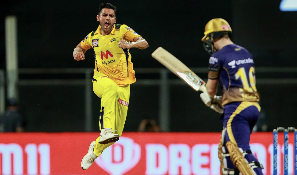 IPL 2021, CSK vs KKR: आईपीएल 2021 के 15वें मुकाबले में चेन्नई सुपर किंग्स (Chennai Super Kings) ने कोलकाता नाइट राइडर्स (Kolkata Knight Riders) को रोमांचक मुकाबले में 18 रनों से हरा दिया. इसी के साथ चेन्नई सुपर किंग्स ने आईपीएल के 14वें सीजन में कोलकाता को हराकर जीत की हैट्रिक लगा दी है. पहले बल्लेबाजी करने आयी धौनी की सेना ने तीन विकेट पर 220 रन का विशाल स्कोर खड़ा किया, जिसे जवाब में कोलकाता की टीम 202 रन ही बना पायी. फाफ डुप्लेसी और रुतुराज गायकवाड़ की अर्धशतकीय पारियों के बाद दीपक चाहर की शानदार गेंदबाजी के बदौतल चेन्नई ने जीत हासिल की.