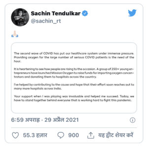 भारत में बढ़ते कोरोना के कहर के बीच मददगारों के हाथ भी बढ़ने लगे हैं. विदेशी क्रिकेटरों की पहल के बाद भारतीय क्रिकेटर भी कोरोना से बीमार मरीजों की मदद के लिए आगे आने लगे हैं. जिसमें मास्टर ब्लास्टर क्रिकेट के भगवान सचिन तेंदुलकर ने अगुआई की.