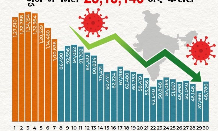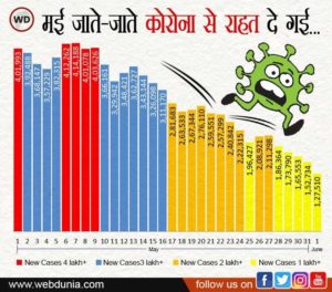 मई में कोरोना ने मचाई तबाही : इससे पहले मई में कोरोना ने भारत में जमकर तबाही मचाई थी। अकेले मई में कोरोनावायरस के 88.82 लाख से अधिक मामले सामने आए थे। इस माह महामारी के चलते 1,17,247 लोगों की जान भी गई थी। 7 मई को 24 घंटे में अब तक कोविड-19 के सर्वाधिक 4,14,188 मामले सामने आए और 19 मई को सबसे अधिक 4529 मरीजों ने अपनी जान गंवाई। हांलाकि 16 मई के बाद देश में कोरोना मरीजों की संख्या में कमी आने लगी थी और 27 मई के बाद नए कोरोना मरीजों की संख्या 2 लाख से कम हो गई।