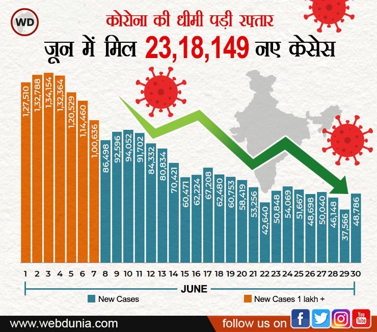 1 जून को देश में 127510 नए मरीज मिले थे 3 जून को आंकड़ा बढ़कर 134154 हो गया। इसके बाद कोरोना के नए मामलों में भारी गिरावट देखी गई। 8 जून को 89498 केस दर्ज किए गए। जून में कोरोना के नए मामलों में भारी गिरावट दिखाई दी और 22 जून को 42640 नए केस सामने आए। 29 जून को सबसे कम 37566 केस सामने आए। अब तक जून में 23,18,149 नए मामले सामने आए। औसत रूप से जून में 77271 नए मामले रोज सामने आ रहे हैं।