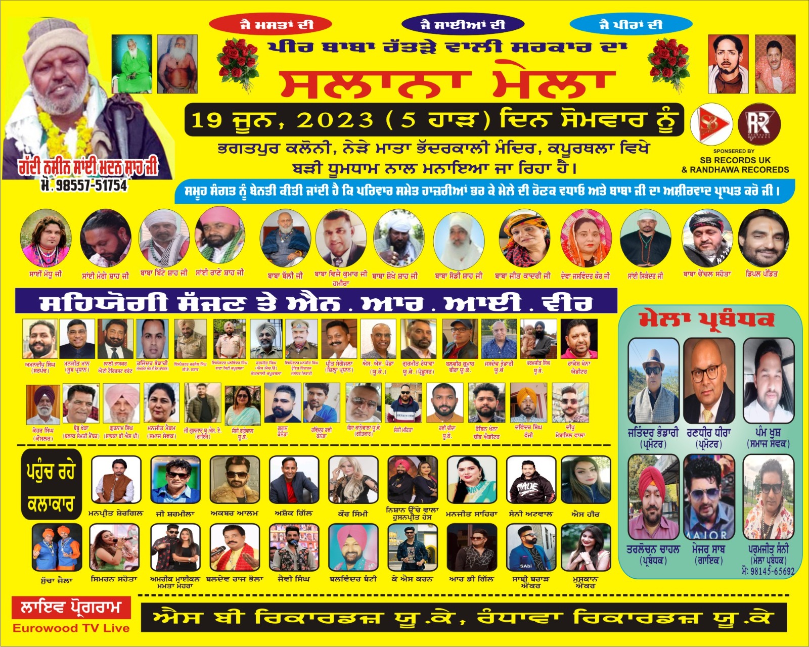 ਕਪੂਰਥਲਾ, 16 ਜੂਨ (ਪਰਮਜੀਤ ਸੰਨੀ)- ਭਗਤਪੁਰ ਕਲੋਨੀ, ਨੇੜੇ ਮਾਤਾ ਭੱਦਰਕਾਲੀ ਮੰਦਿਰ ਜ਼ਿਲ੍ਹਾ ਕਪੂਰਥਲਾ ਵਿਖੇ 19 ਜੂਨ, ਦਿਨ ਸੋਮਵਾਰ (5 ਹਾੜ) ਨੂੰ ਪੀਰ ਬਾਬਾ ਰੱਤੜੇ ਵਾਲੀ ਸਰਕਾਰ ਜੀ ਦਾ ਸਲਾਨਾ ਮੇਲਾ ਬੜੀ ਸ਼ਰਧਾ ਤੇ ਉਤਸ਼ਾਹ ਨਾਲ ਕਰਵਾਇਆ ਜਾ ਰਿਹਾ ਹੈ। ਦਰਬਾਰ ਦੇ ਮੁੱਖ ਸੇਵਾਦਾਰ ਗੱਦੀ ਨਸ਼ੀਨ ਸਾਈਂ ਮਦਨ ਸ਼ਾਹ ਜੀ ਅਤੇ ਮੇਲਾ ਪ੍ਰਬੰਧਕ ਤੇ ਪ੍ਰਮੋਟਰ ਪਰਮਜੀਤ ਸੰਨੀ ਨੇ ਮੇਲੇ ਦੀ ਜਾਣਕਾਰੀ ਦਿੰਦਿਆਂ ਦੱਸਿਆ ਕਿ ਮੇਲੇ ਵਿਚ ਝੰਡੇ ਦੀ ਰਸਮ 10 ਵਜੇ ਆਰੰਭ ਹੋਵੇਗੀ। ਮੇਲੇ ਵਿੱਚ ਵੱਖ ਵੱਖ ਦਰਬਾਰਾਂ ਤੋਂ ਸੰਤ ਲੋਕ ਆਈ ਹੋਈ ਸੰਗਤ ਲਈ ਆਪਣਾ ਆਸ਼ਿਰਵਾਦ ਦੇਣ ਲਈ ਪਹੁੰਚ ਰਹੇ ਹਨ ਜਿਹਨਾਂ ਵਿਚ ਮੱਧੂ ਸਾਈਂ ਜੀ ਜਲੰਧਰ ਵਾਲੇ, ਸਾਈਂ ਮੰਗੇ ਸ਼ਾਹ ਜੀ, ਬਾਬਾ ਬਿੱਟੇ ਸ਼ਾਹ ਜੀ, ਸਾਈਂ ਰਾਣੇ ਸ਼ਾਹ ਜੀ, ਬਾਬਾ ਬੱਲੀ ਜੀ, ਬਾਬਾ ਵਿਜੈ ਕੁਮਾਰ ਜੀ, ਬਾਬਾ ਸੋਖੇ ਸ਼ਾਹ ਜੀ, ਬਾਬਾ ਸੋਢੀ ਸ਼ਾਹ ਜੀ, ਬਾਬਾ ਜੀਤ ਕਾਦਰੀ ਜੀ, ਦੇਵਾ ਜਸਵਿੰਦਰ ਕੌਰ ਜੀ, ਸਾਈਂ ਸਿਕੰਦਰ ਜੀ, ਬਾਬਾ ਚੈਂਚਲ ਸਹੋਤਾ ਅਤੇ ਡਿੰਪਲ ਪੰਡਿਤ ਜੀ ਆਦਿ ਸ਼ਾਮਿਲ ਹਨ। ਇਸ ਵਾਰ ਮੇਲੇ ਵਿਚ ਆਈ ਹੋਈ ਸੰਗਤ ਦੇ ਮੰਨੋਰੰਜਨ ਲਈ ਸਟੇਜੀ ਪ੍ਰੋਗਰਾਮ ਵੀ ਕਰਵਾਇਆ ਜਾ ਰਿਹਾ ਹੈ ਜਿਹਨਾਂ ਵਿਚ ਪ੍ਰਸਿੱਧ ਗਾਇਕ ਮਨਪ੍ਰੀਤ ਸ਼ੇਰਗਿੱਲ, ਜੀ ਸ਼ਰਮੀਲਾ, ਅਕਬਰ ਆਲਮ, ਅਸ਼ੋਕ ਗਿੱਲ, ਗਾਇਕਾ ਕੌਰ ਸਿੰਮੀ, ਦੋਗਾਣਾ ਜੋੜੀ ਨਿਸ਼ਾਨ ਉੱਚੇਵਾਲਾ ਤੇ ਹੁਸਨਪ੍ਰੀਤ ਹੰਸ, ਗਾਇਕਾ ਮਨਜੀਤ ਸਾਹਿਰਾ, ਗਾਇਕ ਸੰਨੀ ਅਟਵਾਲ, ਗਾਇਕਾ ਐੱਸ ਹੀਰ, ਗਾਇਕ ਸੁੱਚਾ ਜੈਲਾ, ਗਾਇਕਾ ਸਿਮਰਨ ਸਹੋਤਾ, ਦੋਗਾਣਾ ਜੋੜੀ ਅਮਰੀਕ ਮਾਇਕਲ ਤੇ ਮਮਤਾ ਮਹਿਰਾ, ਬਲਦੇਵ ਰਾਜ ਭੋਲਾ, ਜੈਵੀ ਸਿੰਘ, ਬਲਵਿੰਦਰ ਬੰਟੀ, ਕੇ ਐੱਸ ਕਰਨ, ਆਰ ਡੀ ਗਿੱਲ, ਐਂਕਰ ਸਾਬੀ ਬਰਾੜ ਅਤੇ ਐਂਕਰ ਮੁਸਕਾਨ ਆਦਿ ਕਲਾਕਾਰ ਸ਼ਾਮਿਲ ਹਨ। ਇਸ ਮੇਲੇ ਨੂੰ ਐਨ ਆਰ ਆਈ ਵੀਰਾਂ ਤੇ ਕਮੇਟੀ ਮੈਂਬਰਾਂ ਦੇ ਸਹਿਯੋਗ ਨਾਲ ਕਰਵਾਇਆ ਜਾ ਰਿਹਾ ਹੈ ਅਤੇ ਮੇਲੇ ਨੂੰ ਐੱਸ ਬੀ ਰਿਕਾਰਡਜ਼ ਯੂ. ਕੇ. ਅਤੇ ਰੰਧਾਵਾ ਰਿਕਾਰਡਜ਼ ਯੂ. ਕੇ. ਵੱਲੋਂ ਸਪਾਂਸਰ ਕੀਤਾ ਜਾ ਰਿਹਾ ਹੈ ਅਤੇ ਇਸ ਦਾ ਸਿੱਧਾ ਪ੍ਰਸਾਰਣ ਯੁਰੋਵੁਡ ਟੀ. ਵੀ. ਲਾਈਵ ਦੇ ਯੂਟਿਊਬ ਚੈਨਲ ’ਤੇ ਹੋਵੇਗਾ। ਆਖਿਰ ਵਿਚ ਆਈ ਹੋਏ ਲੋਕਾਂ ਲਈ ਅਟੁੱਟ ਲੰਗਰ ਵਰਤਾਇਆ ਜਾਵੇਗਾ।